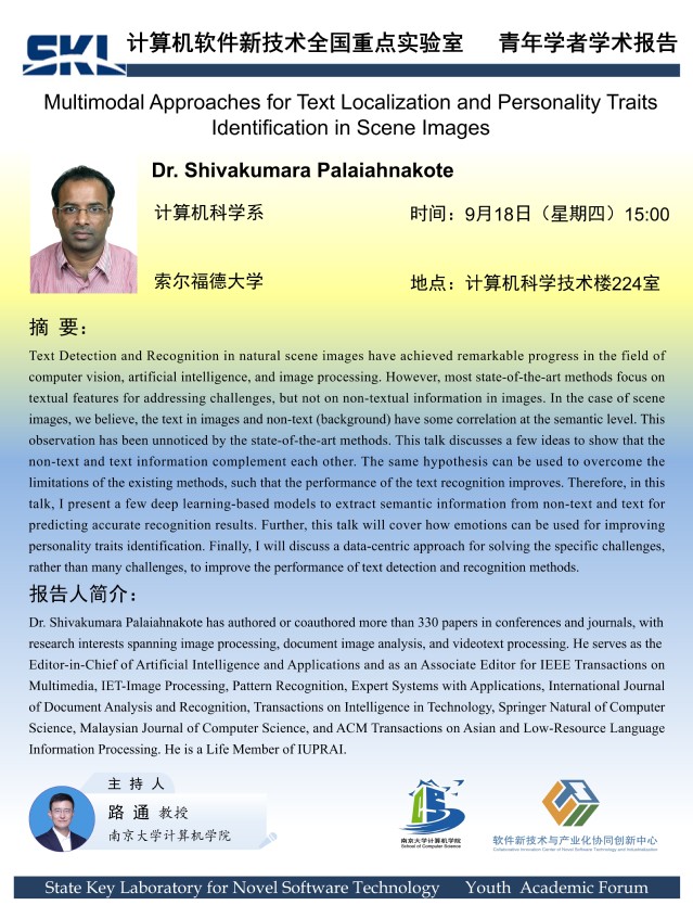 2025年9月18日 “软件新技术讲坛” 学术报告 - Dr. Shivakumara Palaiahnakote