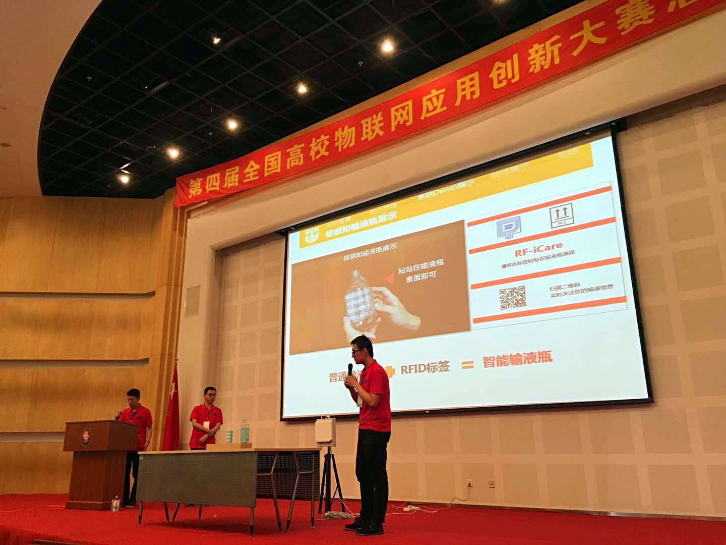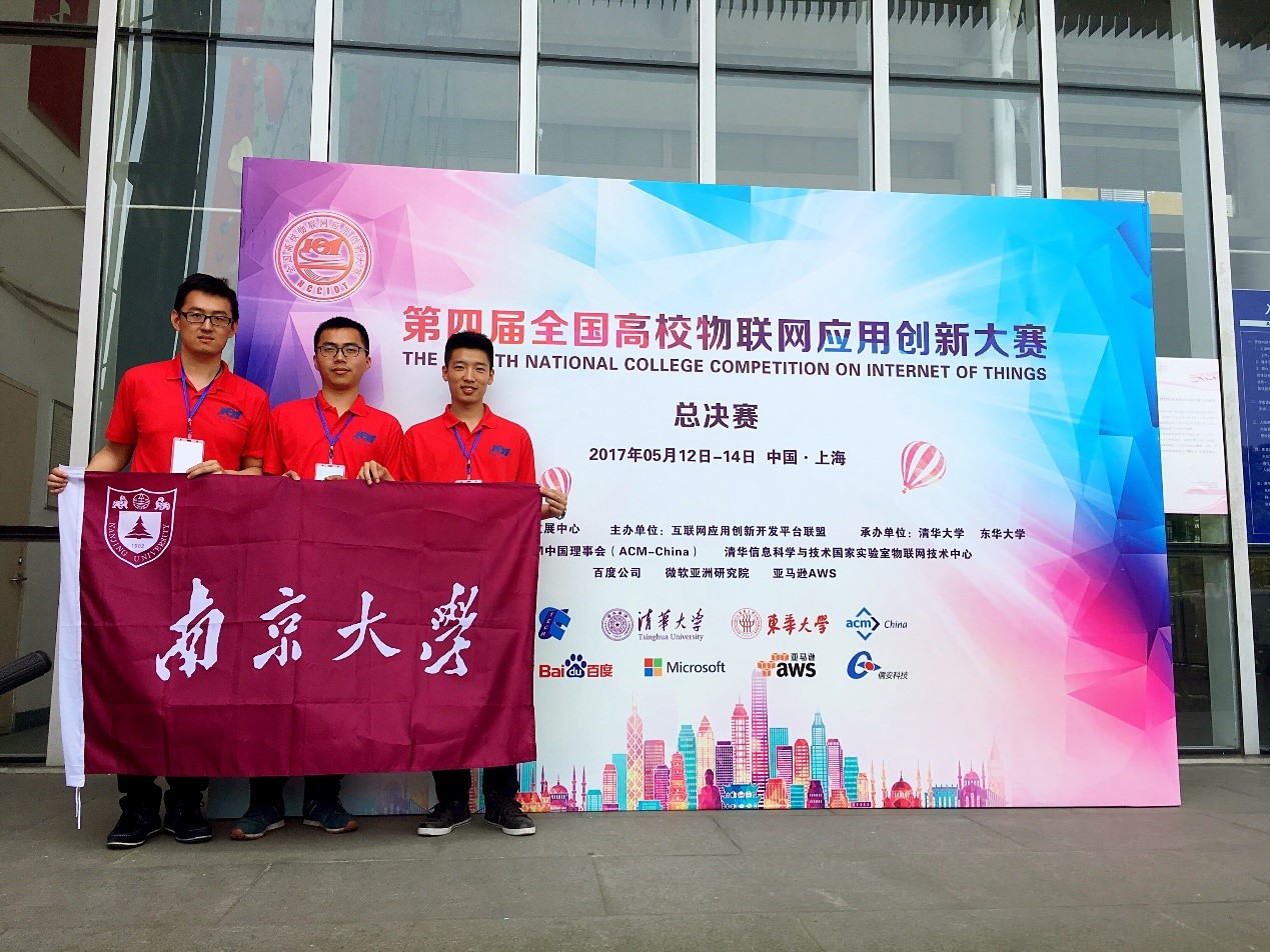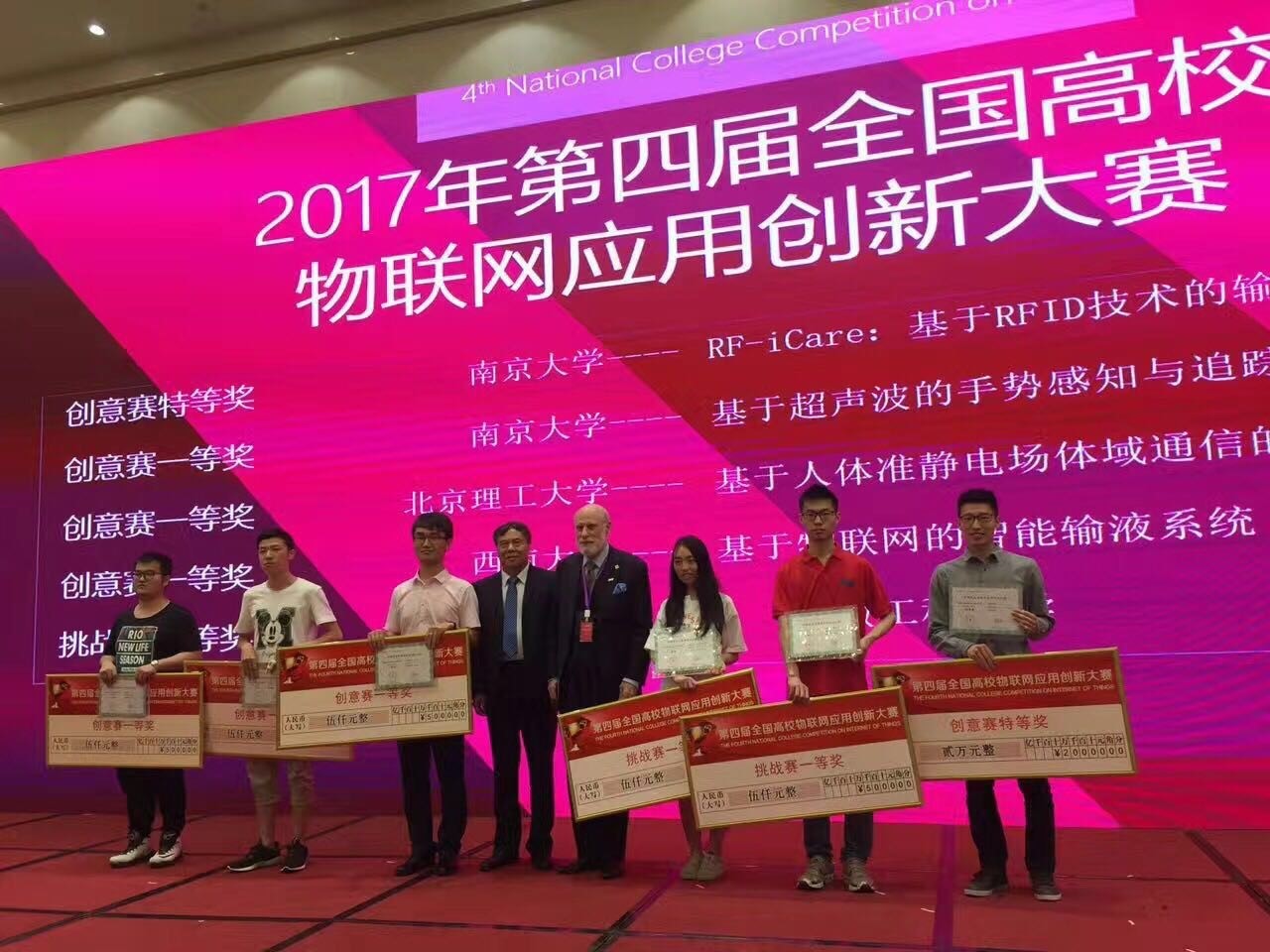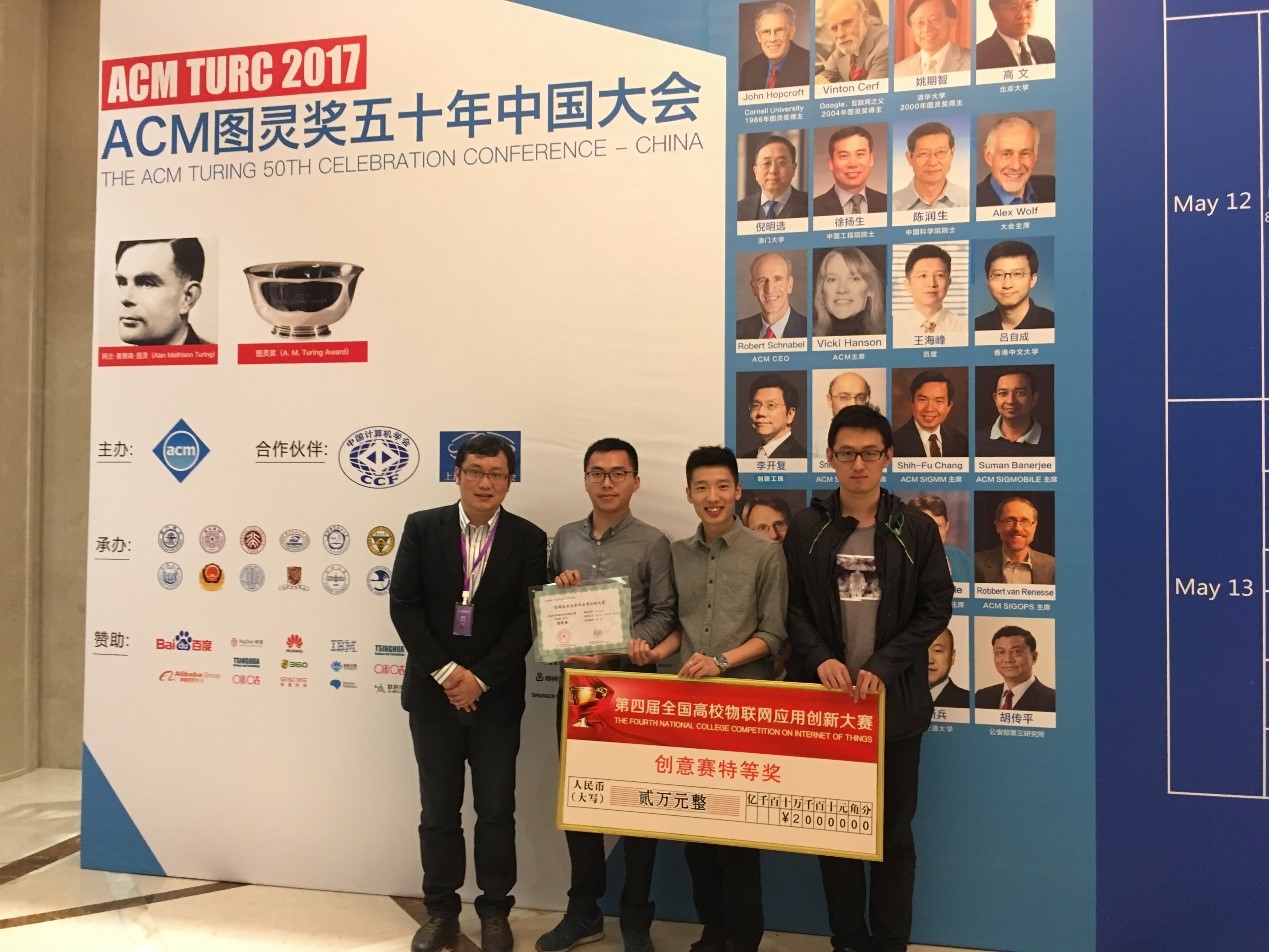 2017年5月12 – 14日,由教育部科技发展中心主办的第四届全国高校物联网应用创新大赛创意赛全国总决赛在东华大学图文信息大楼第一报告厅成功举办。我系分布式计算团队(成员:何兵兵,张柯岩,陆逸嘉;指导教师:谢磊)凭借“RF-iCare:基于RFID技术的输液监测系统”,从全国七大赛区1050只队伍中脱颖而出,获得第1名的优异成绩,夺得创意赛全国特等奖。我系团队(成员:孙珂、凌康;指导教师:戴海鹏)凭借“基于超声波的手势感知与追踪”的项目夺得总决赛第2名和一等奖(其中特等奖一名,一等奖三名,二等奖六名)。谢磊和戴海鹏作为团队指导教师分别获得最佳指导教师奖。在ACM图灵奖五十年中国大会的庆功晚宴暨赛事颁奖典礼上,图灵奖获得者、互联网之父Vinton Cerf和教育部科技发展中心李志民主任参与颁奖典礼,并颁发特等奖和最佳指导老师奖奖牌。出席者还包括图灵奖获得者John Hopcroft,ACM主席Vicki Hanson,ACM Fellow、IEEE Fellow、清华大学软件学院院长刘云浩等。此次总决赛的参赛队伍共有从七大赛区选拔出来的包括成人网 、清华大学、武汉大学、哈尔滨工业大学、华中科技大学、西安交通大学等在内的42所高校75支参赛队伍。