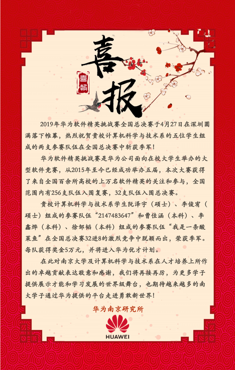 本系学生阮泽宇(硕士)、李俊宥(硕士)组成的参赛队伍“2147483647”和曹佳涵(本科)李鑫烨(本科)、徐邹韬(本科)组成的参赛队伍“我是一条酸菜鱼”在全国总决赛32进8的激烈竞争中脱颖而出,荣获季军。每队获得奖金5万元,并将进入华为优才计划。