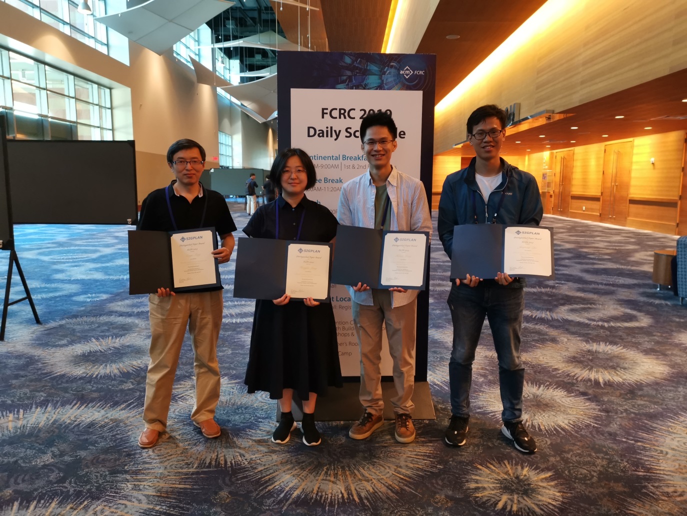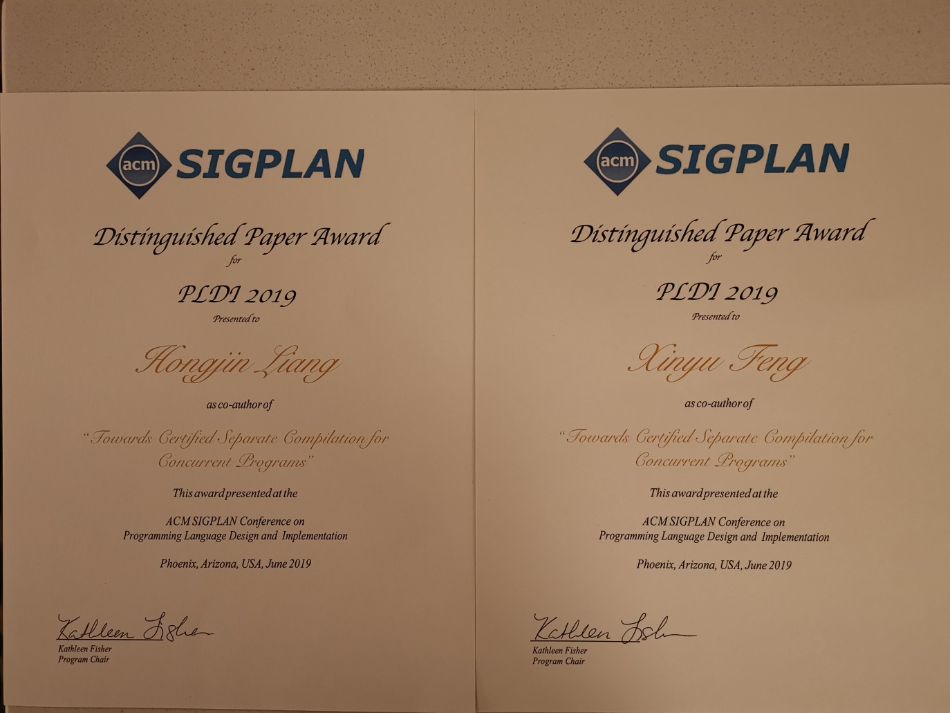 2019年6月22日至26日,第40届程序设计语言设计与实现会议(ACM SIGPLAN Conference on Programming Language Design and Implementation,PLDI 2019)在美国凤凰城举行,成人网 计算机科学与技术系程序设计语言研究组冯新宇教授、梁红瑾副教授及其团队的论文“Towards Certified Separate Compilation for Concurrent Programs”荣获本次会议的杰出论文奖(Distinguished Paper Award)。