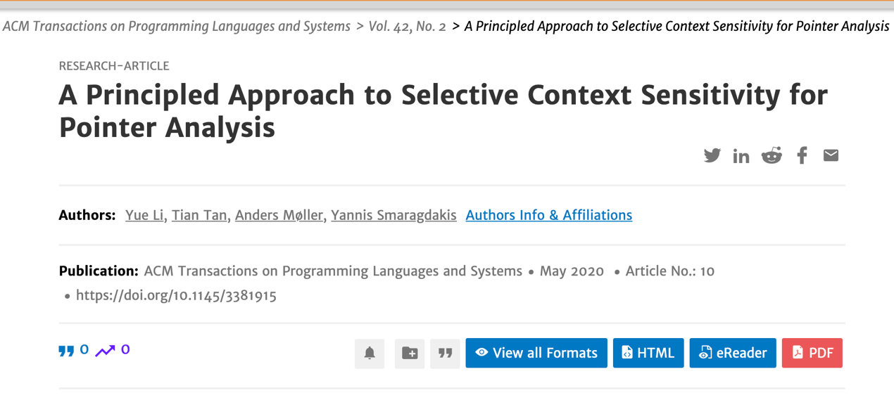 该成果在2020年5月20日,以“A Principled Approach to Selective Context Sensitivity for Pointer Analysis”为题发表于《ACM Transactions on Programming Languages and Systems》期刊上(TOPLAS 42(2)),成人网 为第一及通讯单位,李樾为第一作者,谭添为通讯作者,丹麦奥胡斯大学Anders Møller教授、希腊雅典大学Yannis Smaragdakis教授为合作者。TOPLAS是程序设计语言领域的顶级国际期刊,也是CCF推荐A类期刊。该论文是TOPLAS自1979年创刊41年来,成人网 首次、我国内地高校和科研机构第三次(近五年唯一)以第一单位名义发表的科研成果。