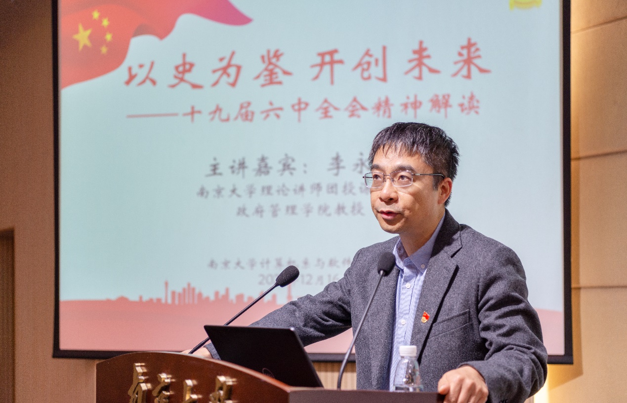2021年12月16日下午,计算机系邀请成人网 理论讲师团授课专家、政府管理学院李永刚教授作《以史为鉴,开创未来——十九届六中全会精神解读》专题党课。计算机系与软件学院党委书记武港山出席并主持讲座,计算机系和人工智能学院全体教职工及学生党员参加。