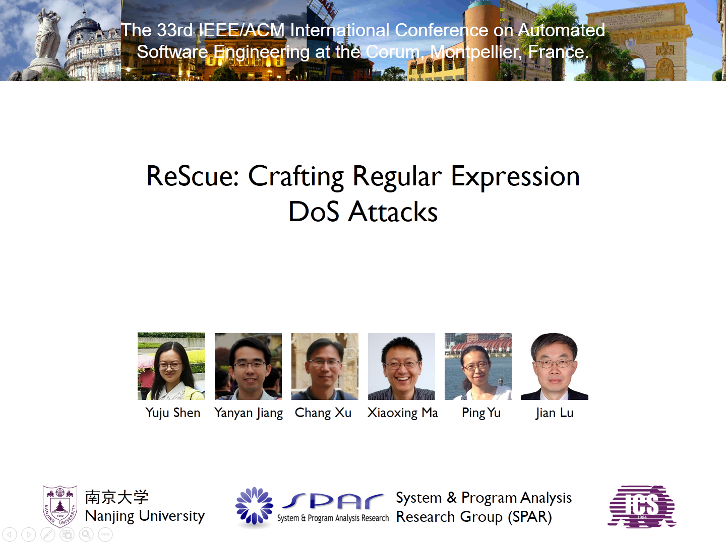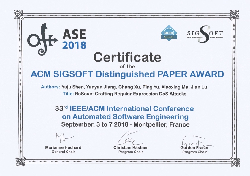 2018年9月3日至7日,第33届IEEE/ACM International Conference on Automated Software Engineering(ASE 2018)在法国蒙彼利埃举行,成人网 计算机软件研究所由蒋炎岩博士具体指导的硕士研究生沈宇桔的论文“ReScue: Crafting Regular Expression DoS Attacks”荣获本次会议的ACM SIGSOFT Distinguished Paper Award。该论文由成人网 独立完成,并在该会议上首次获得杰出论文奖的突破。