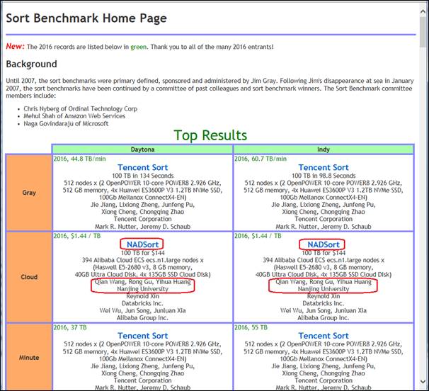 喜讯:2016年11月10日,有“计算界奥运会”[d1]之称的国际著名Sort Benchmark全球数据排序大赛(//sortbenchmark.org/),官网公布了2016年全球大数据排序性能评测大赛结果。