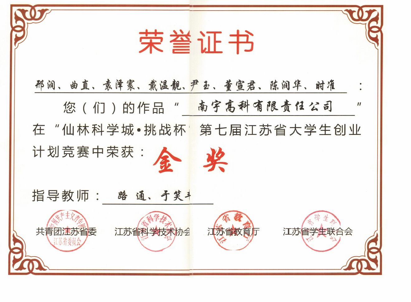 9. As the 1st supervisor, the thesis titled "Research on Multiclass Object Detection Algorithm and Its Applciations" won the First Prize of Excellent BSc Thesis Team of Jiangsu Province (The first team won this award in the Dept. of Computer Science and Technology, Nanjing University), 2011