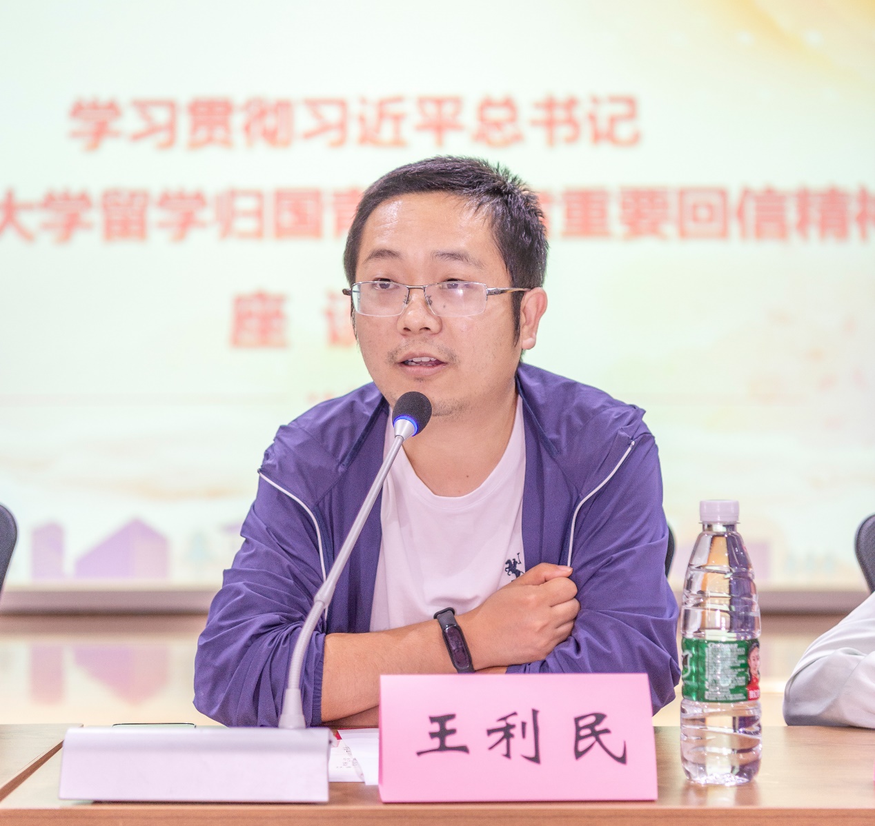 留学归国青年教师代表王利民教授分享了自己的求学经历与科研工作情况。作为一名科研工作者,王老师一早就明确了学成归国的目标,他分享自己的初心是“出去是为了更好地回来”。结合习近平总书记提到的立德树人与科技自立自强,王老师表示自己将引导学生树立正确的价值观,不断提高学生学术能力,带领他们做“顶天立地”的科研工作。