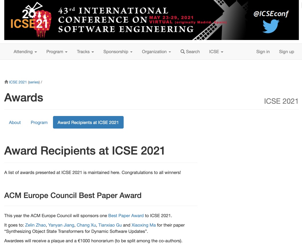 近日,国际软件工程大会(International Conference on Software Engineering, ICSE)官方网站公布大会奖项,成人网 计算机软件所团队的论文《Synthesizing Object State Transformers for Dynamic Software Updates》获得了由ACM Europe Council支持的大会唯一最佳论文奖(Best Paper Award),并获1000欧元奖金。该论文同时也获得了ACM SIGSOFT杰出论文奖(Distinguished Paper Award)。
