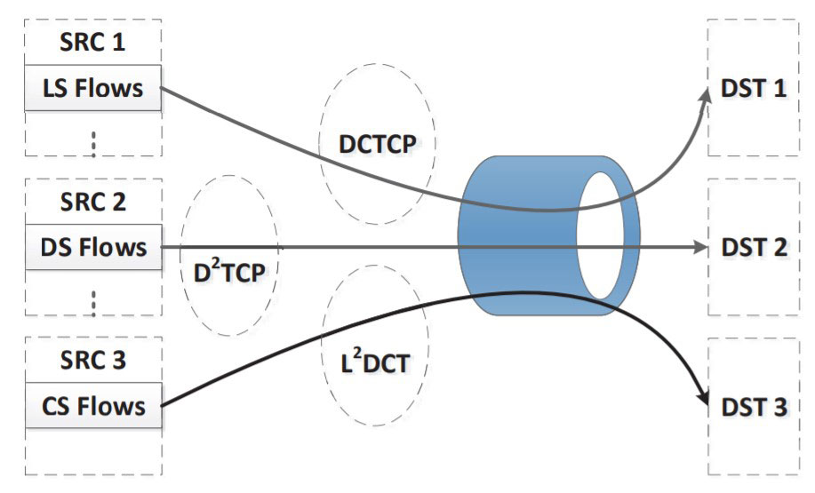 2、网络&应用联合调度 数据中心内, 不同应用的流量有着不同的性能指标和分布规律。例如大数据流量对带宽敏感而对时延不敏感,而交互性流量则相反。我们致力于数据中心流量调度机制的研究,通过网络调度来平衡各类应用的性能。
