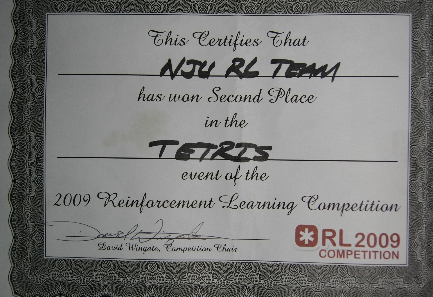 Zhenzhiwei Scholarship, Nanjing University, 2009. - Second place on Tetris event, Reinforcement Learning Competition, 2009. (NJU RL Team)
